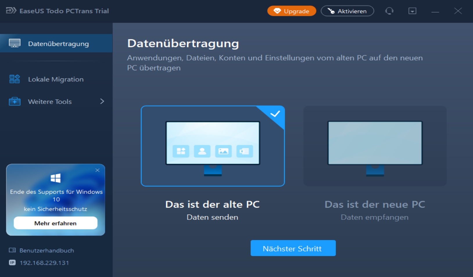Einen besonderen Fokus legt EaseUS Todo PCTrans Pro auf eine klar strukturierte Oberfläche mit deutschsprachigen Assistenten. Beim Start sehen Sie auf einen Blick die wichtigsten Funktionen und wählen, ob Sie direkt von PC zu PC übertragen, eine Übertragung über eine Image-Datei vorbereiten oder Daten aus einem defekten System wiederherstellen möchten. Jede Variante wird in logische Einzelschritte unterteilt, die verständlich erklärt werden, sodass Sie auch ohne IT-Vorkenntnisse zielstrebig zum Ergebnis gelangen. Die Menüs bleiben übersichtlich und konzentrieren sich auf das Wesentliche, damit Sie nicht von technischen Details abgelenkt werden.